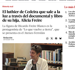 La figura de Ricardo Freire Blanco es la protagonista de “Lo que vuelve a tierra”, que se presenta en el Ateneo Ferrolán. “Lo que vuelve a tierra” fue autoeditado bajo el propio sello de la directora, Cine Viena, y el libro acaba de ver la luz este año con Gráficas Lar. En este proyecto da a conocer el recorrido de su padre, el luthier nacido en Cedeira Ricardo Freire Blanco, que se vio obligado…